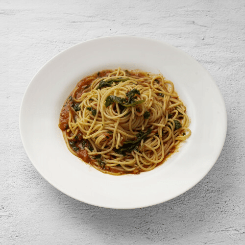 mit Spinat, Knoblauch, Tomatensauce und einer Nudelsorte nach Wahl